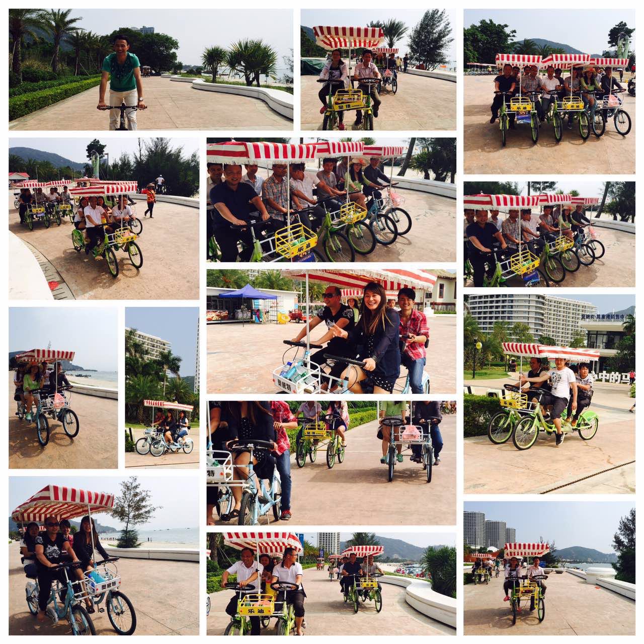 第二天一早大家便來到了素有中國式馬爾代夫之稱巽寮灣海灘邊,欣賞白沙灘,綠藍分明的海水,體驗了慢船在海中捕魚及快艇海中速度般飛越的感覺,大家都意猶未盡不舍上岸……拓展公司見我們都不愿意離開,簡單的午餐過后,組織了大家集體騎自行車環海觀光,一邊悠閑地踩著自行車,一邊吃著冰激淋,一邊吹著海風和同事們嘻鬧,讓我們大家都開懷大笑!