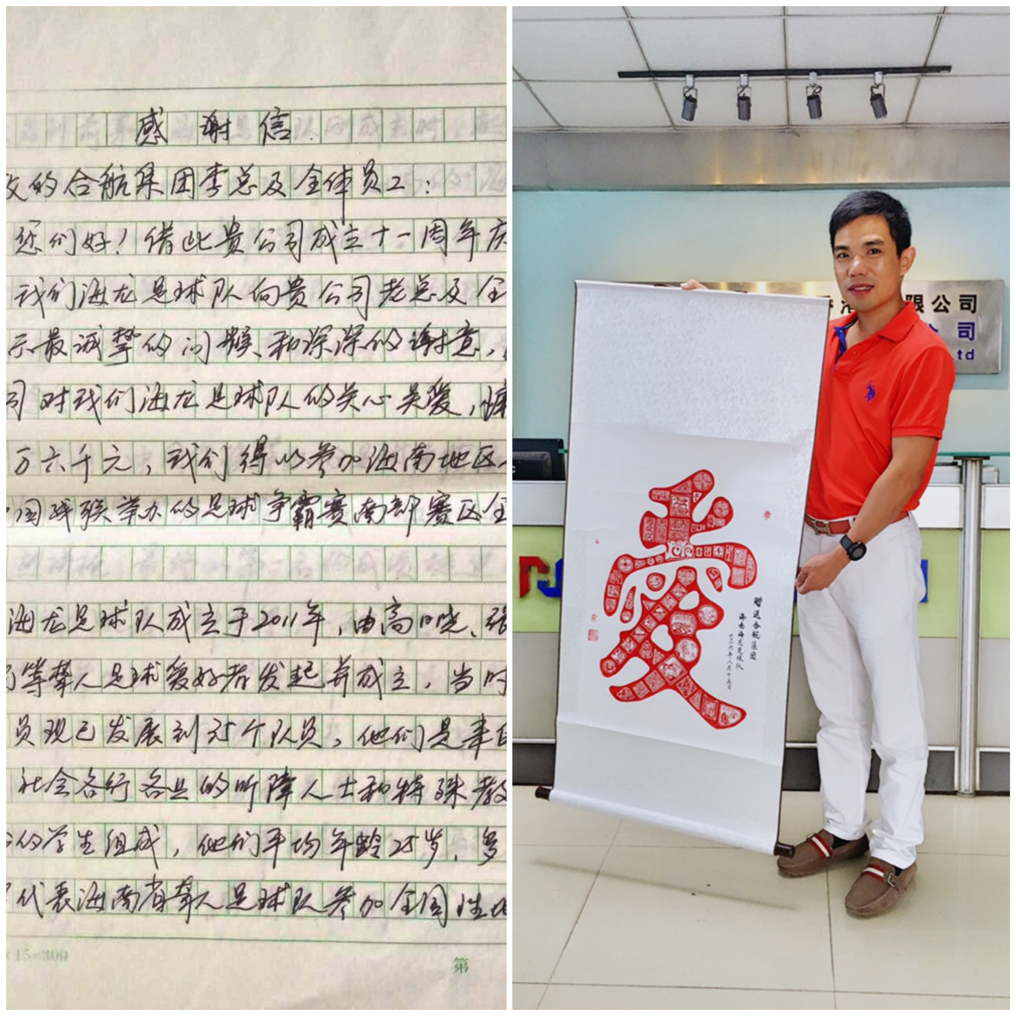合航集團愛心基金會自成立以來,一直秉持著關(guān)愛員工回饋社會的理念,為幫助這群可愛的孩子筑夢,合航集團于2015年十周年慶典上向海南省海龍足球隊捐贈人民幣五萬元整,并于2016年開始正式撥款資助球隊比賽。海龍足球隊為感謝合航集團的關(guān)愛,特意為我司李董寄來了親筆感謝信及紀念品,讓愛散播在每個角落是我們共同努力的目標(biāo)。